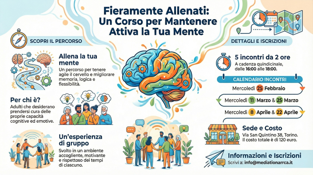 Il corso prevede cinque incontri a cadenza quindicinale di due ore che si svolgeranno in presenza presso la sede di Mediation ARRCA, via San Quintino 38, Torino, dalle 16 alle 18 con il seguente calendario: